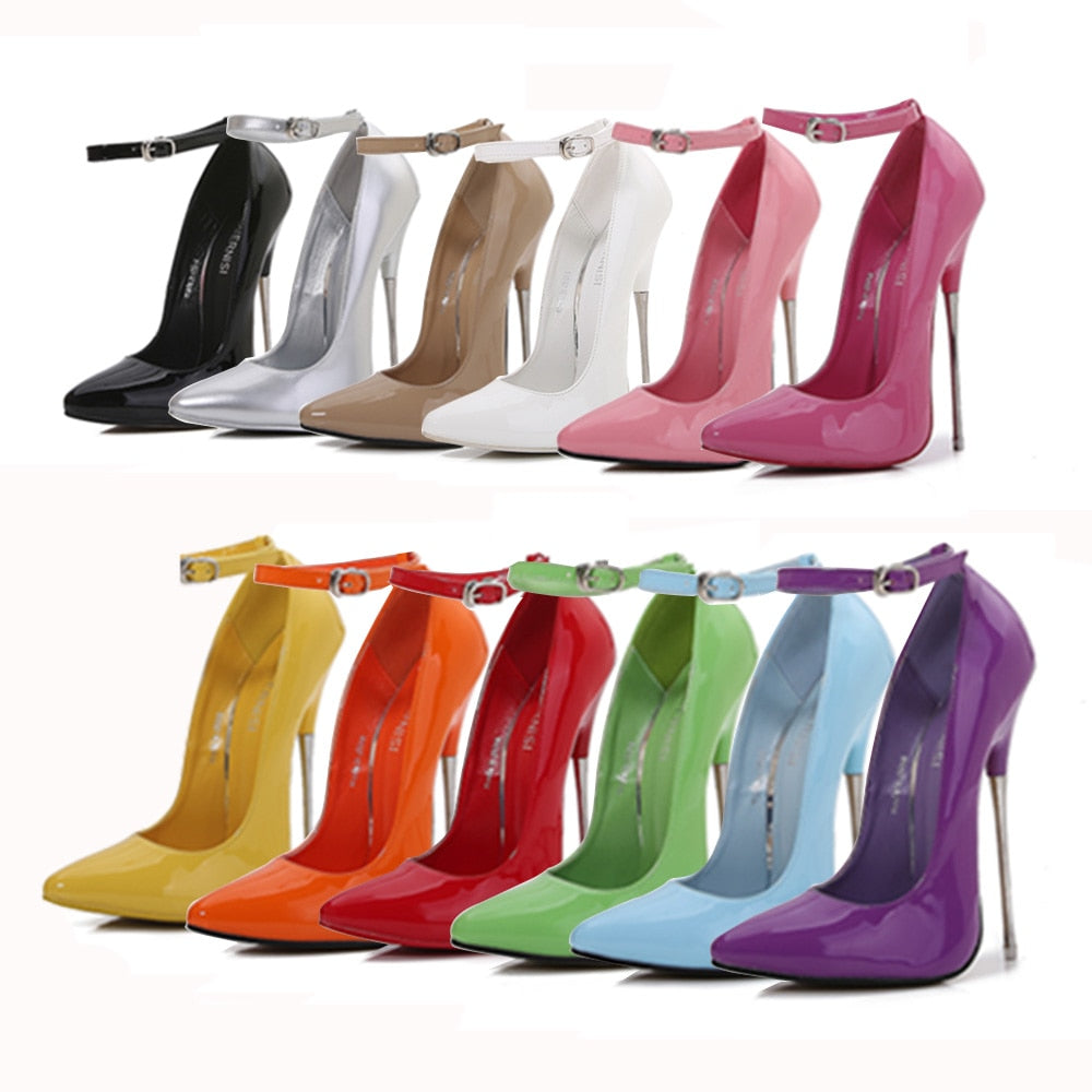 16cm Super High Heels Metal Thin Heel Multicolor Women Pumps Fetish High Heeled Shoes Model Ankle Buckle Women Shoes Big Size 46