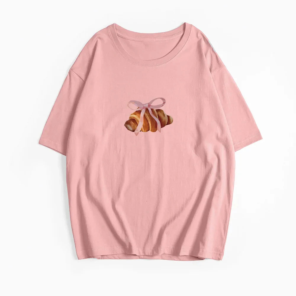 Bow And Horn Print White Summer T-shirt 2025 New Short Sleeve O-neck All-match Women Tee Top Streetwear Fashion Woman Clothing