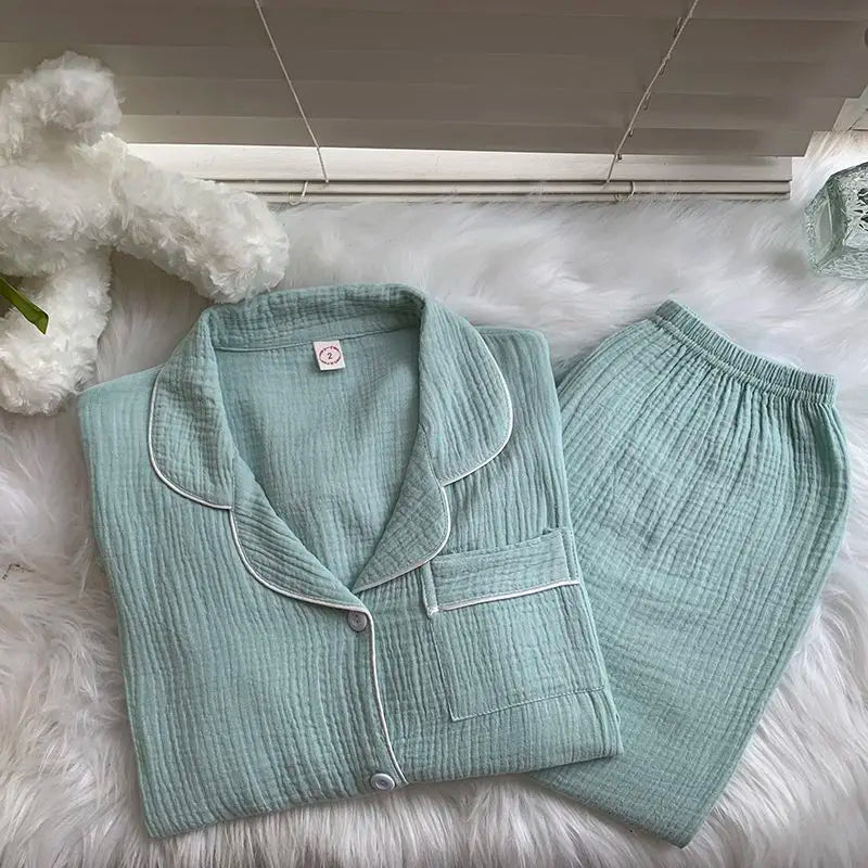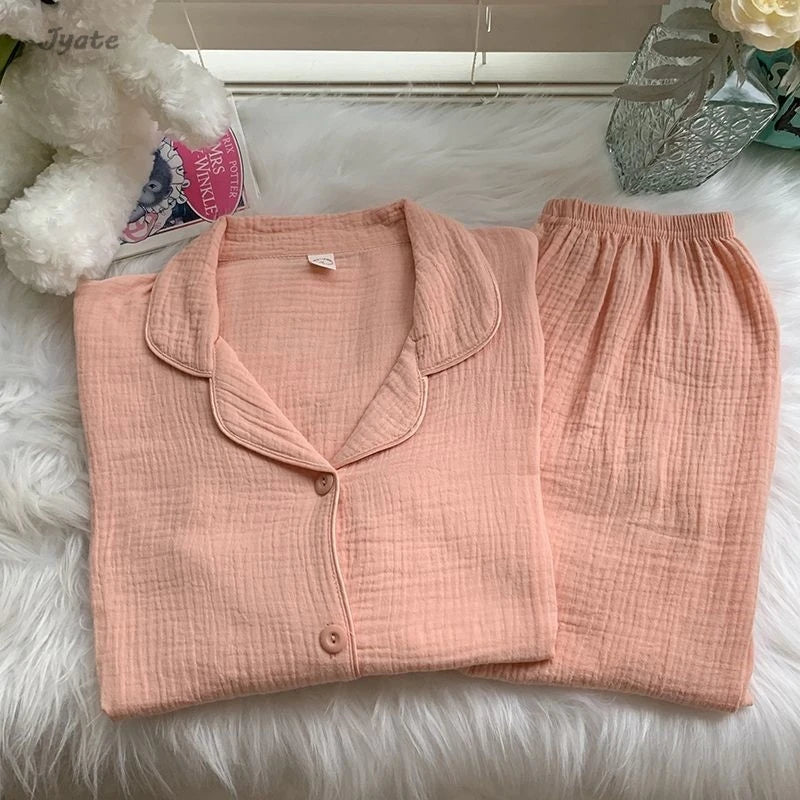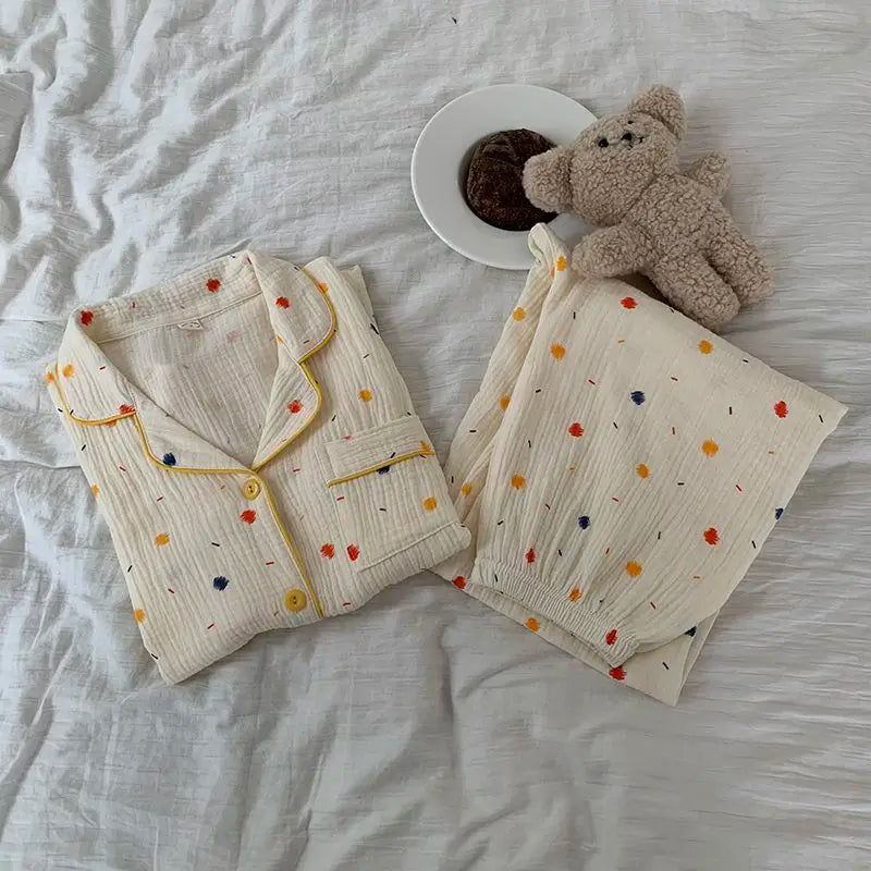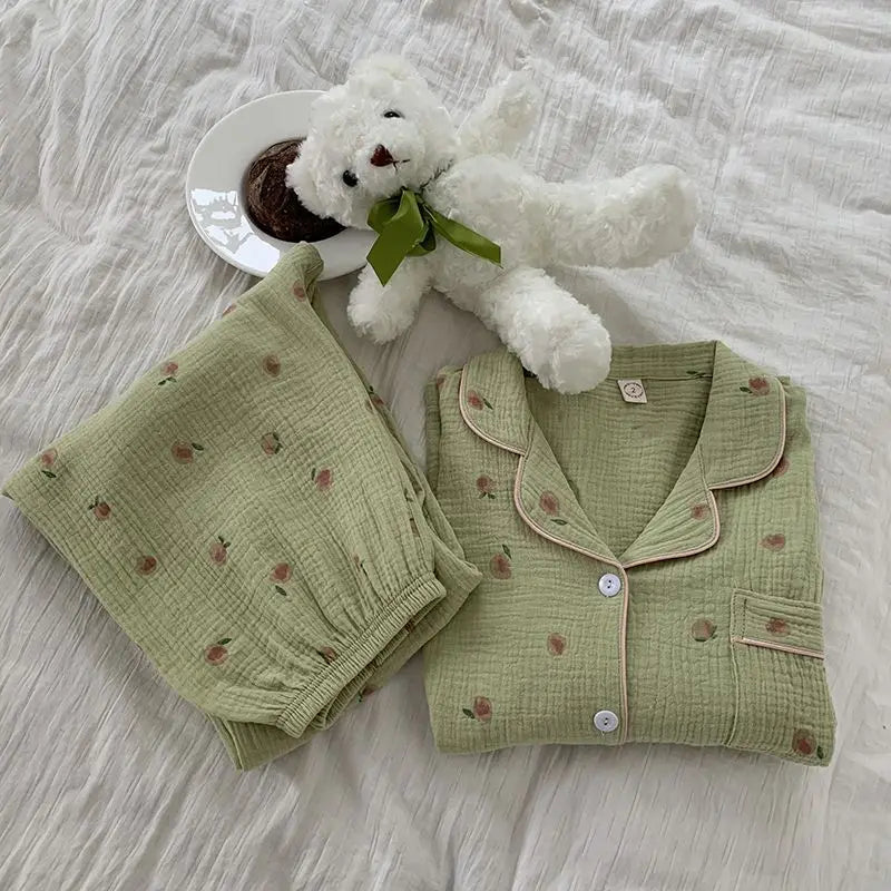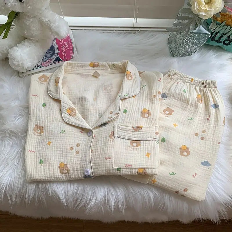 Cotton Comfort Sleepwear Casual Women Pajamas Spring Summer Cherry Print Cute Lapel Button Shirts And Pant Two Piece Sets 2024