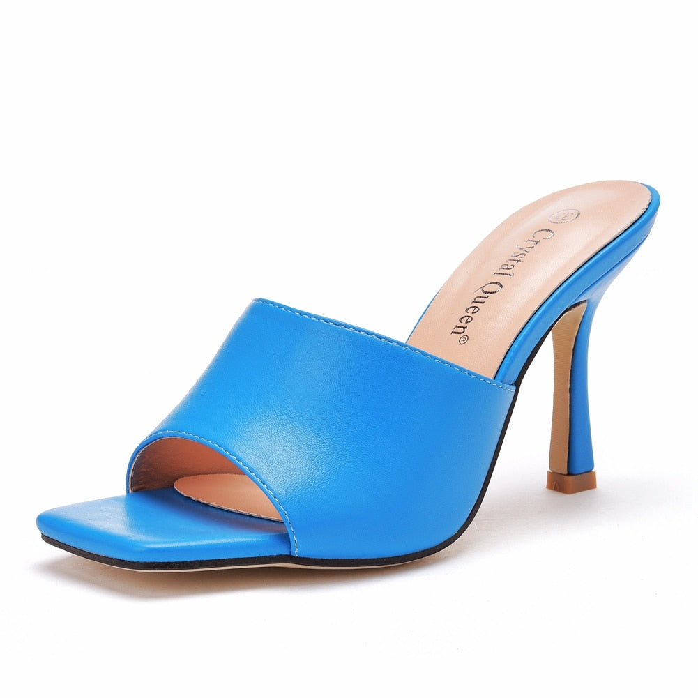 Crystal Queen Summer Women Sandals Square Toe Ladies Mules Sexy Thin High Heels Slippers Female Fashion Shoes