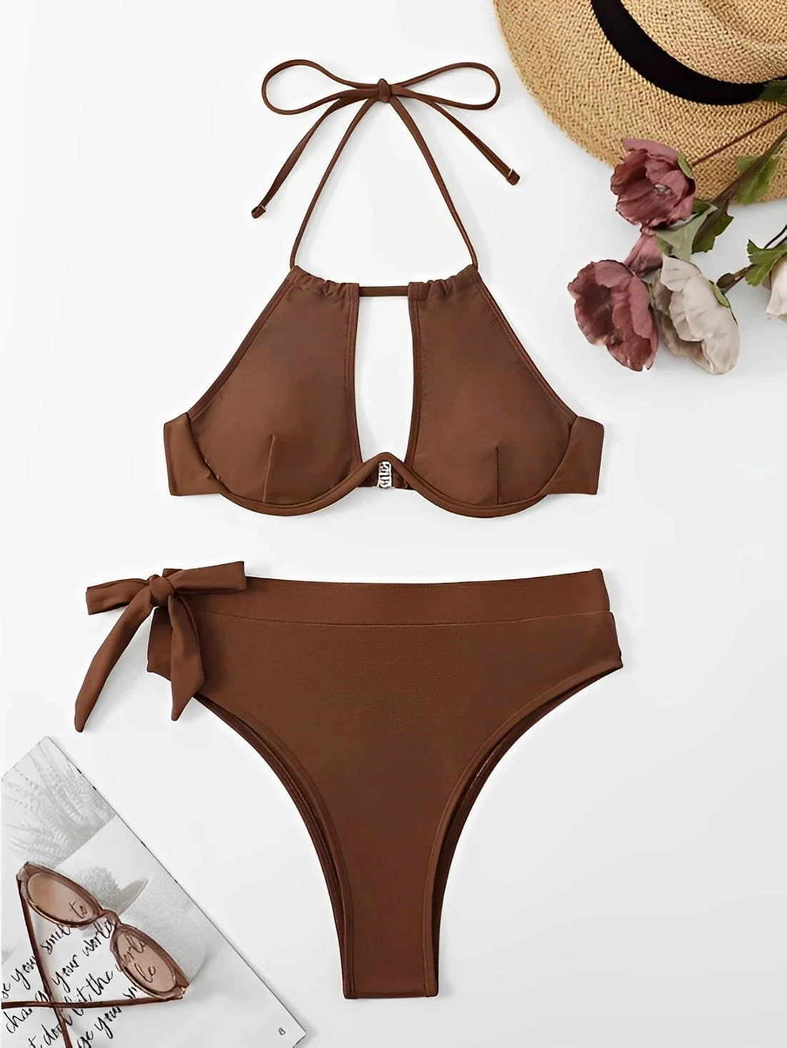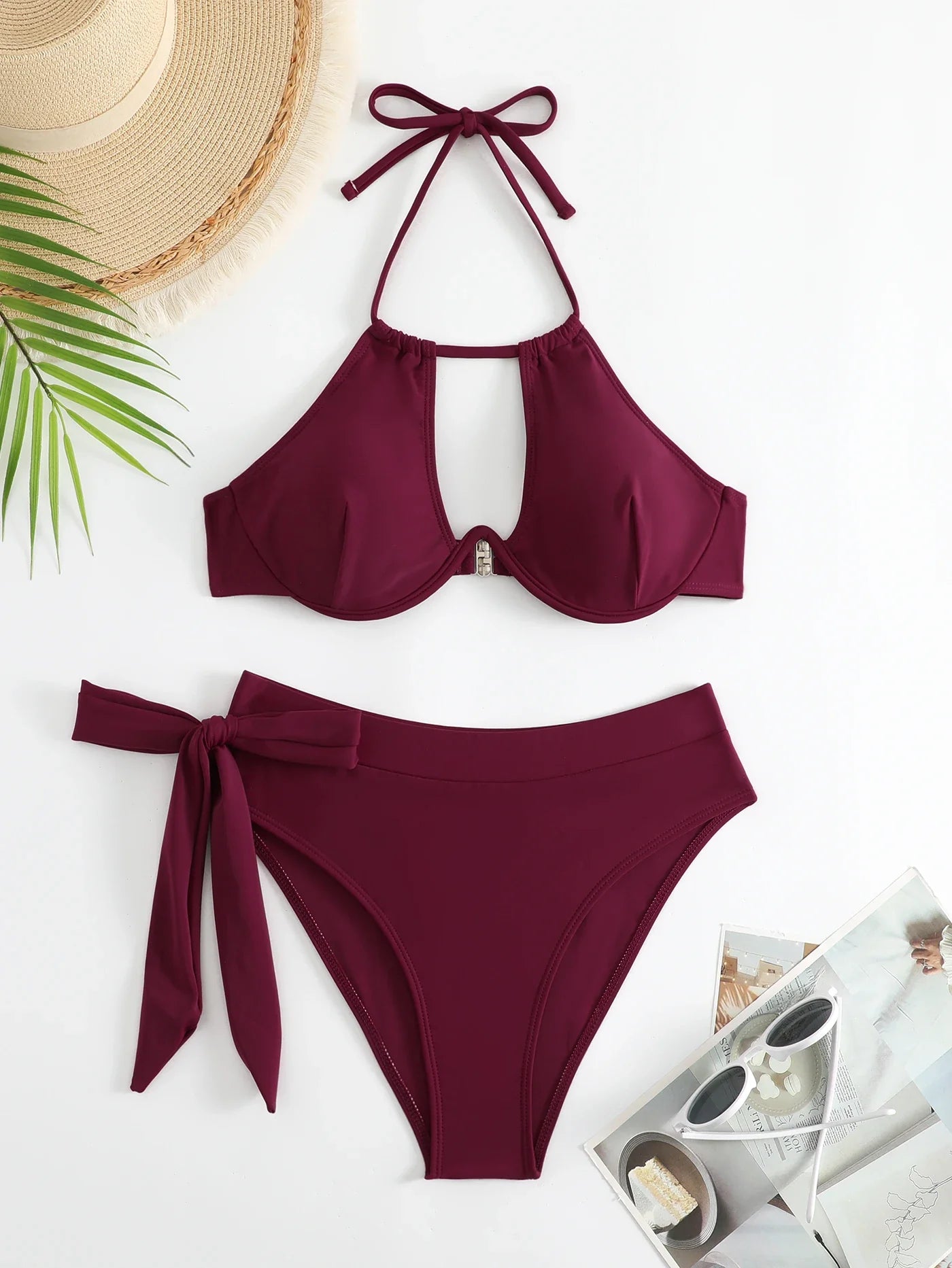 Cut-out Push Up Bikini Solid Halter Swimsuit Women High Waist Swimwear Female Bathers Bathing Swimming Swim Suit Beachwear