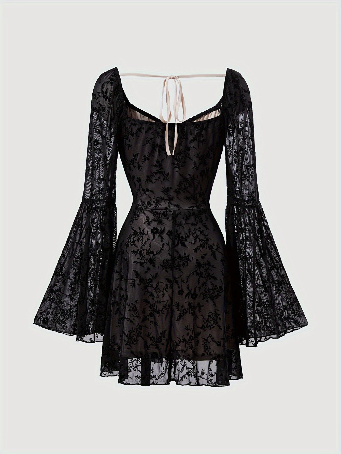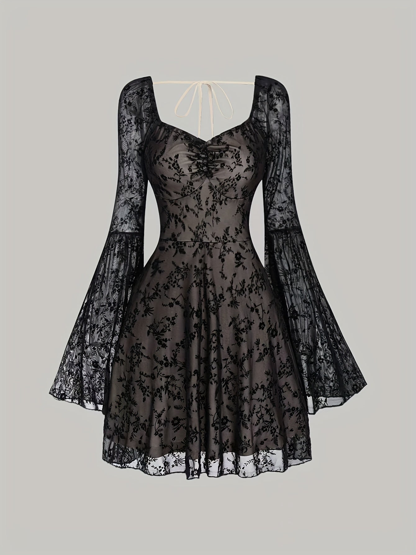 Elegant Floral Lace Long Sleeve Dress. Polyester Knit Fabric. Fitted Square Neckline with Tie Detail. for Women. All-Season Wear. Lace Dress