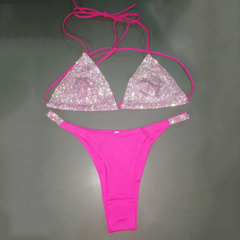 Luxury Bling Rhinestone Bikini Sliver Set 2020 New Crystal Diamond Sexy Women Swimsuit Halter Push Up Bandage Swimwear Bikini Set