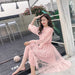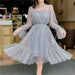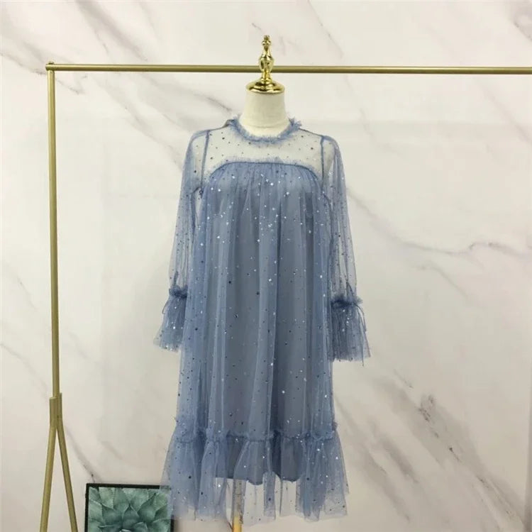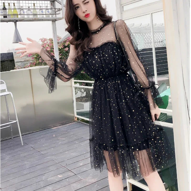 New Arrivals Summer Women Lace Dress Sequined Appliques A-line Mesh Patchwork Solid Dress Fairy Long Sleeves Knee-length Dress
