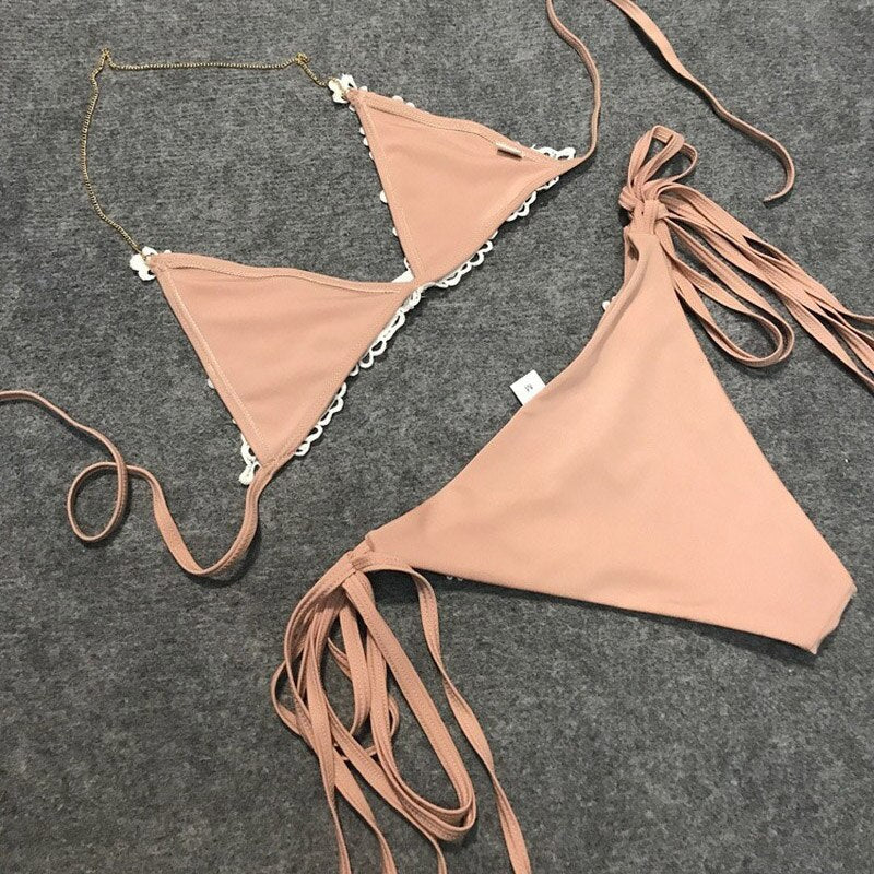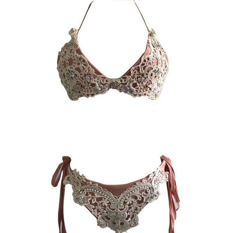 Swimsuit Women Embroidery Split Swimsuit Lace-up Side Lace Bikini Vest Briefs Suit Girls Swimwear Bathing Suit