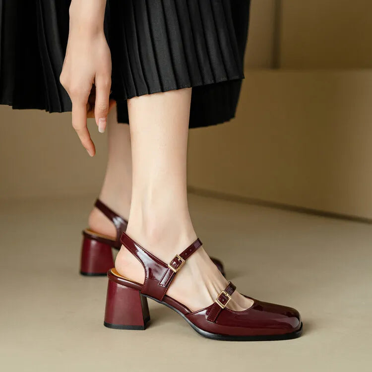 Ochanmeb Patent Leather Mary Jane Sandals Women Block High Heels Double Buckle Shoes Woman Square Toe Big Size 44-46 Sandal Shoe