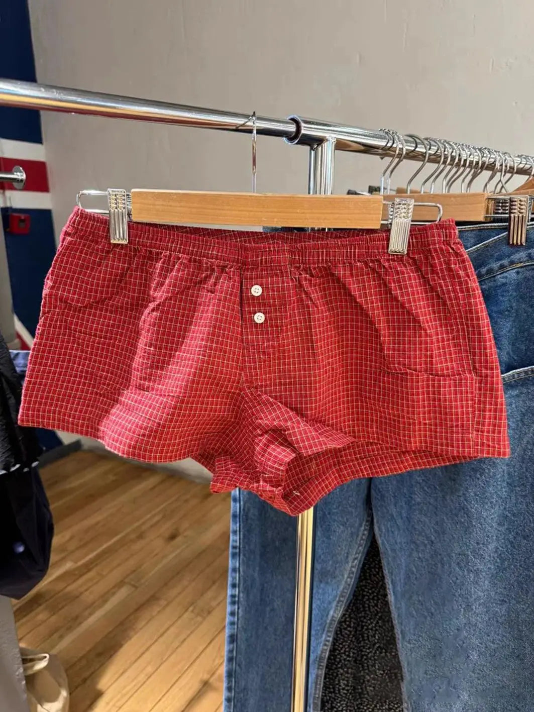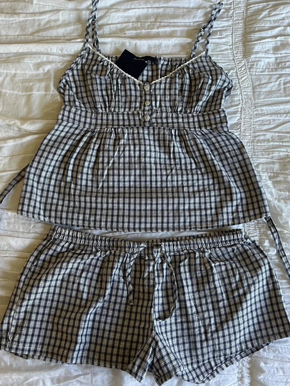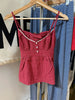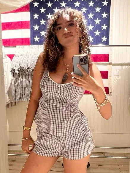 Red Plaid Buttons Tank Shorts Set Woman Back Lace-up Lace Trim Slim Camis+Elastic Waist Sweatshorts Sweet Cotton 2 Piece Sets