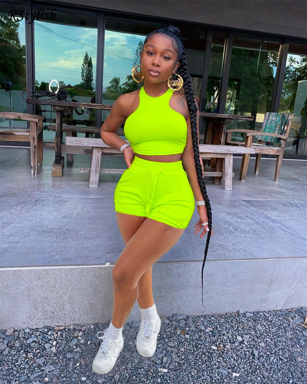 RStylish Solid Color Suits Sleeveless Sexy Crop Top Vest and Shorts Two Piece Set Women's Summer Outfits Clothes Short Sets