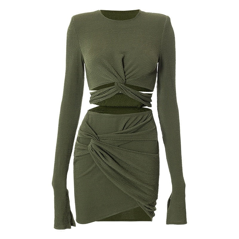 Solid Color Fashion Sexy Two-Piece Sets Hollow Design Short Top + Mini Slim Skirt For Women Go Out Street Club Party Wear