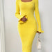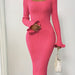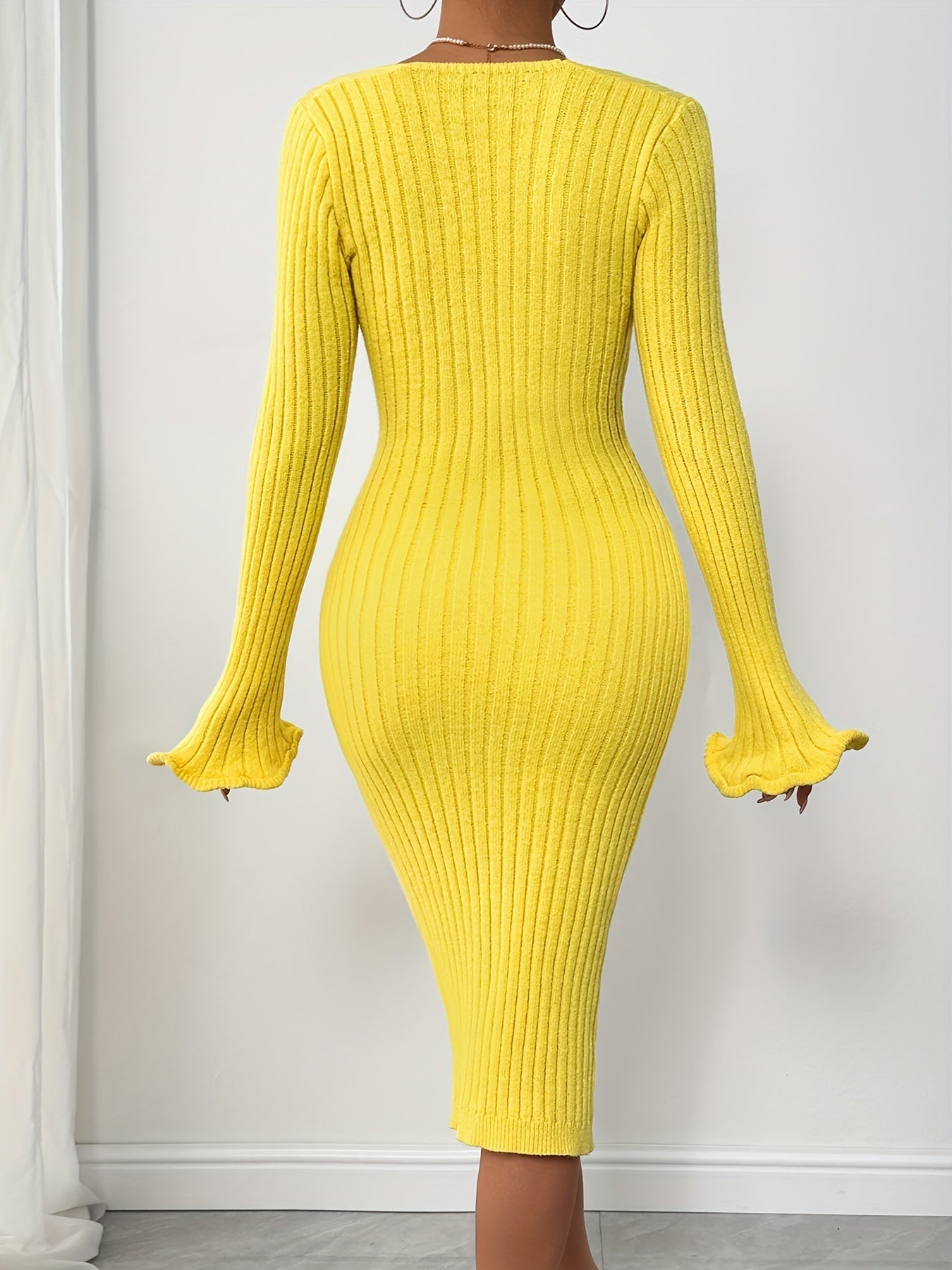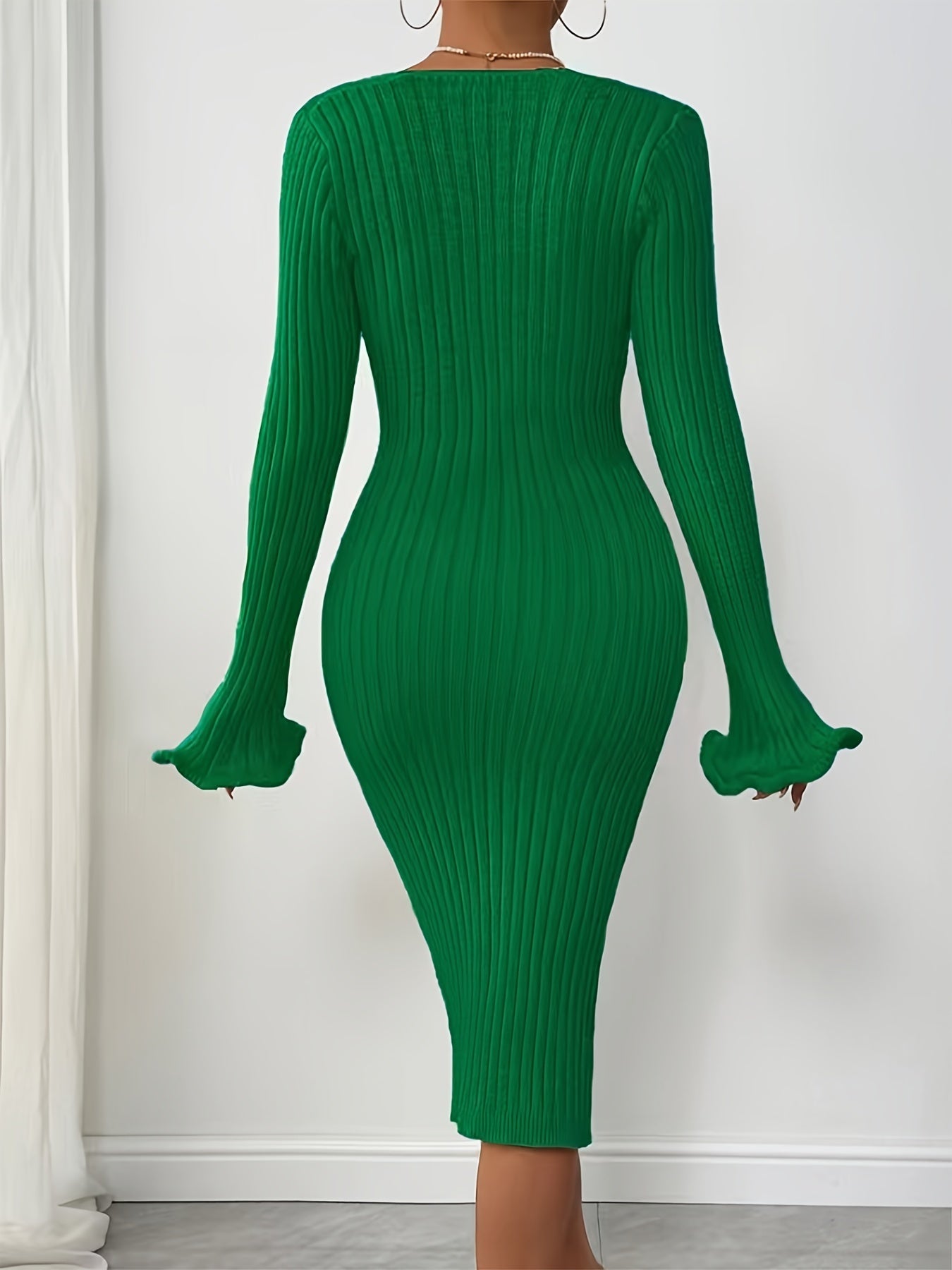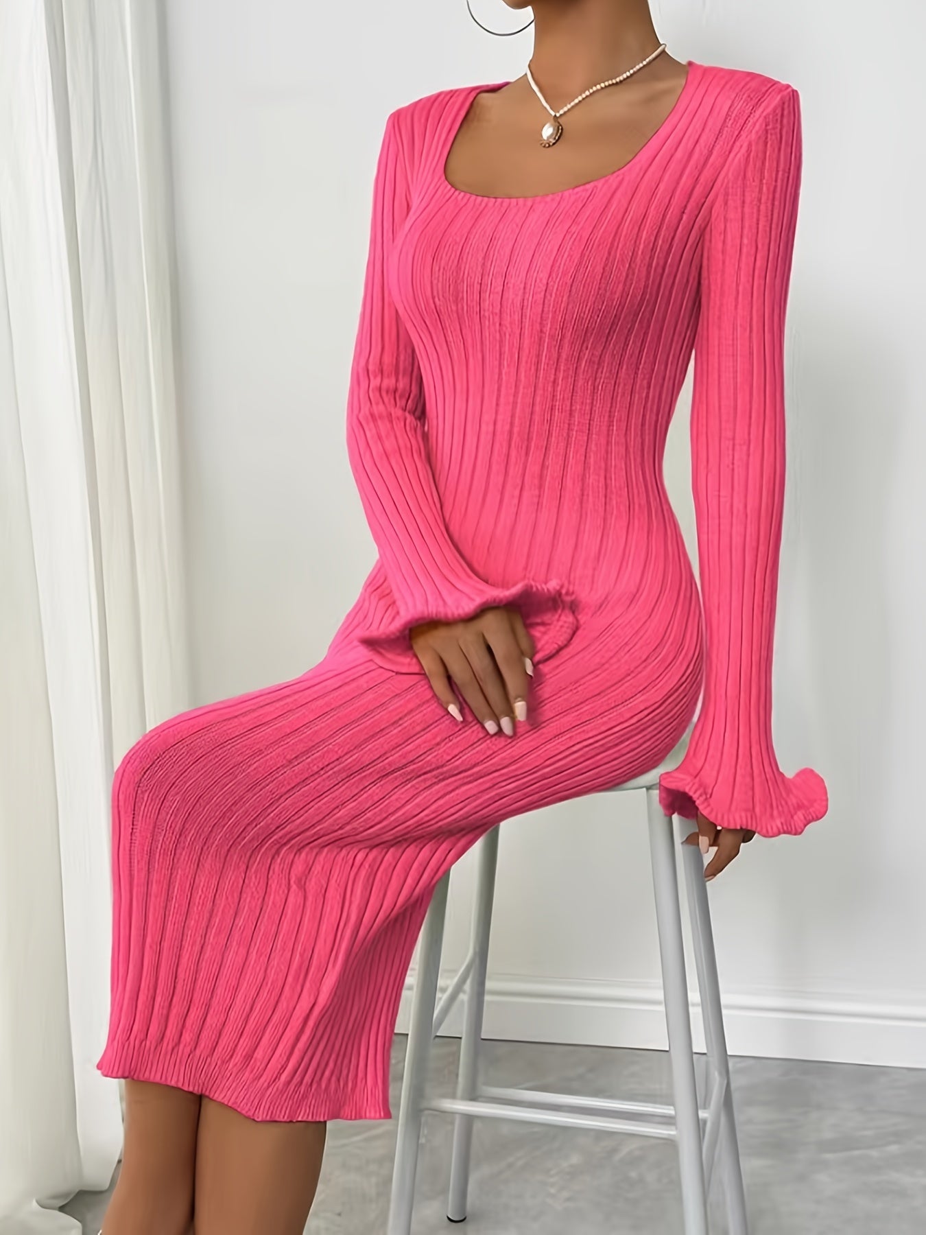 Solid Pattern Bodycon Sweater Dress - Acrylic Blend. Elegant Ribbed Knit. Middle Eastern Style. Lettuce Trim Fluted Sleeves. Square Neckline