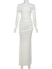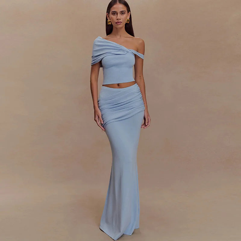 Solid Slim Long Skirt Suit For Women Slanted Shoulder Tank Top Sexy Ruched Splice High Waist Skirt Sets Summer New Ladies