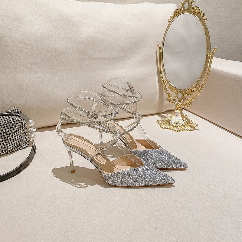 Spring and summer new sequin rhinestone lace pointed sandals thin high heel banquet dress versatile large women's single shoes