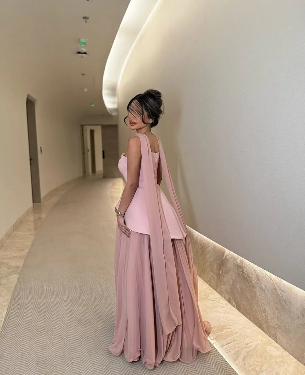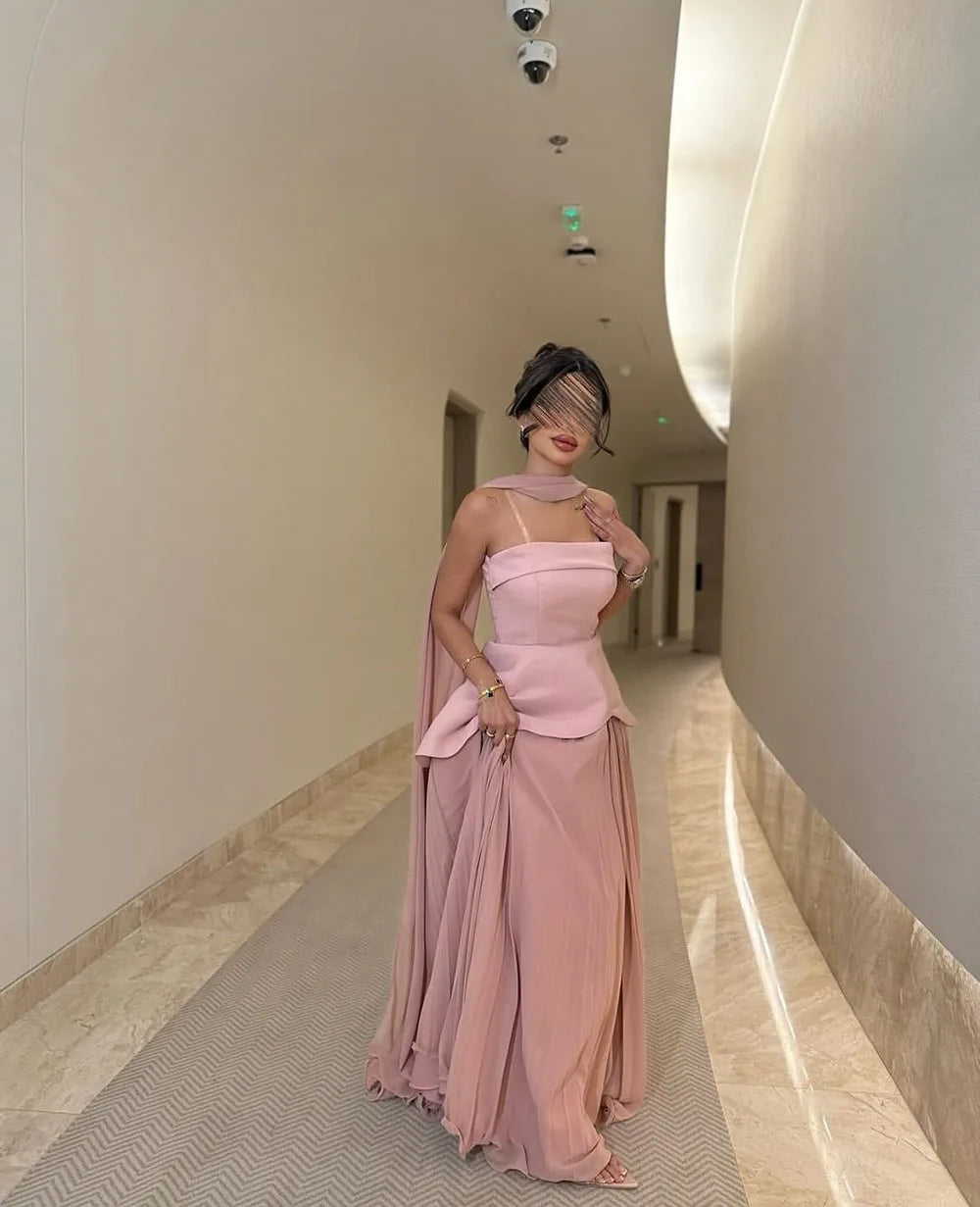 Strapless Satin Pink A Line Evening Dress 2025 Saudi Arabic Formal Gown Cape Prom Dress Wedding Party Gown Customized