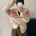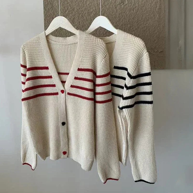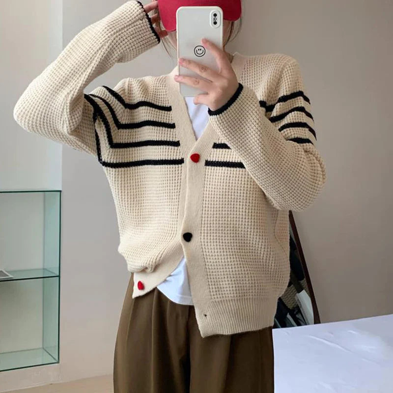 Striped Knit Cardigan Sweater with Heart-shape Button Front V-Neck Sweater Jacket Female Autumn Winter French Chic Cute Outfit