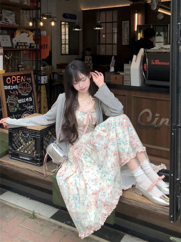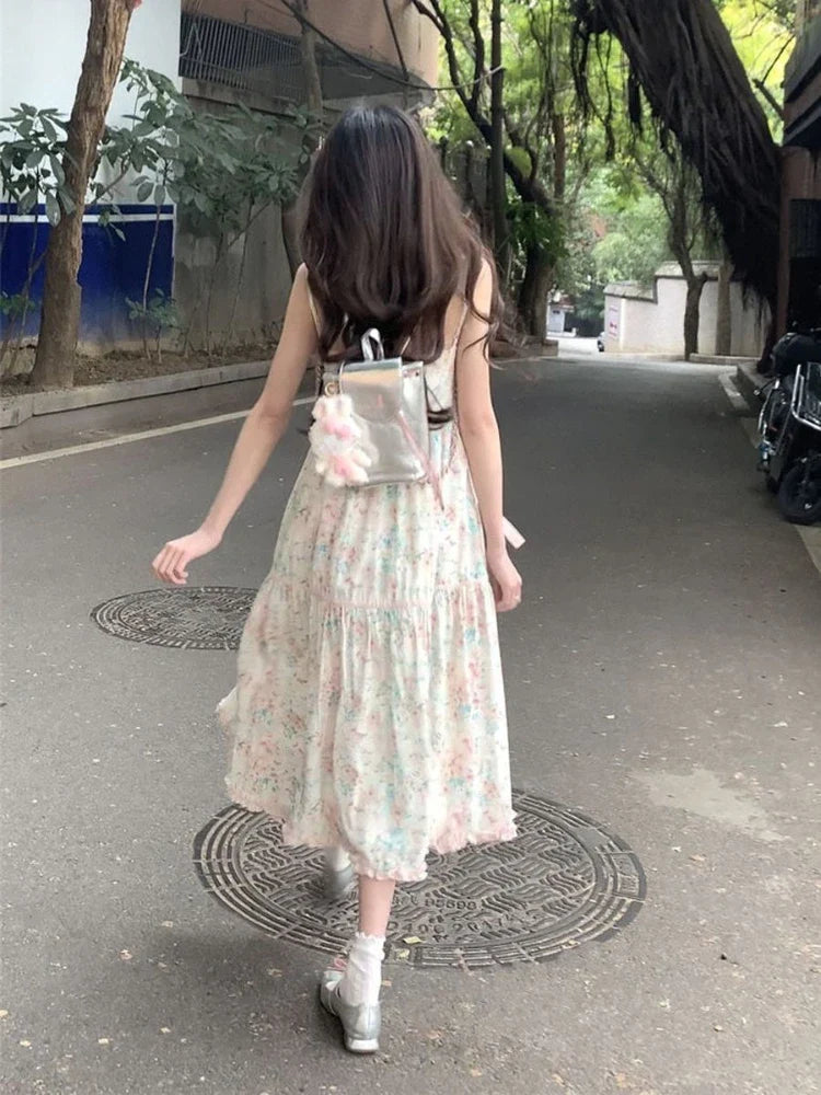 Summer New Japanese Kawaii Y2k Midi Dress Women Casual Sweet Bow Splicing Flower Print Dress Korean Fashion Evening Party