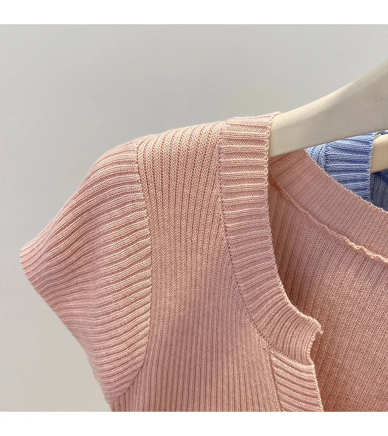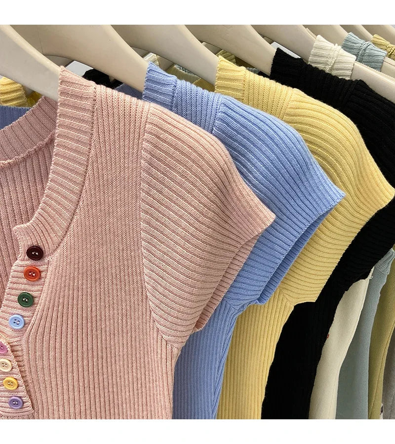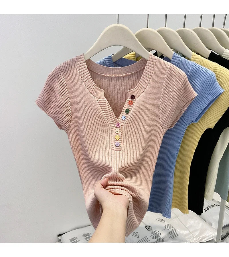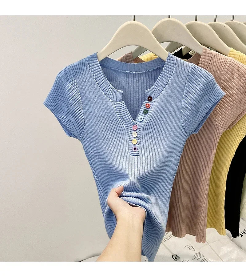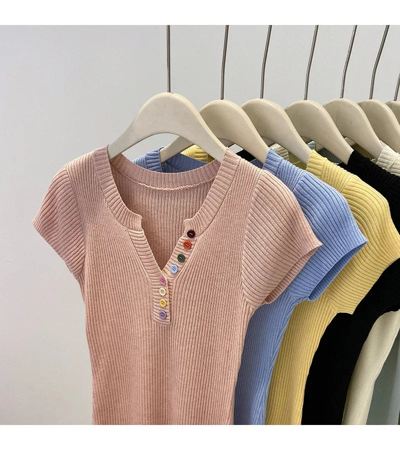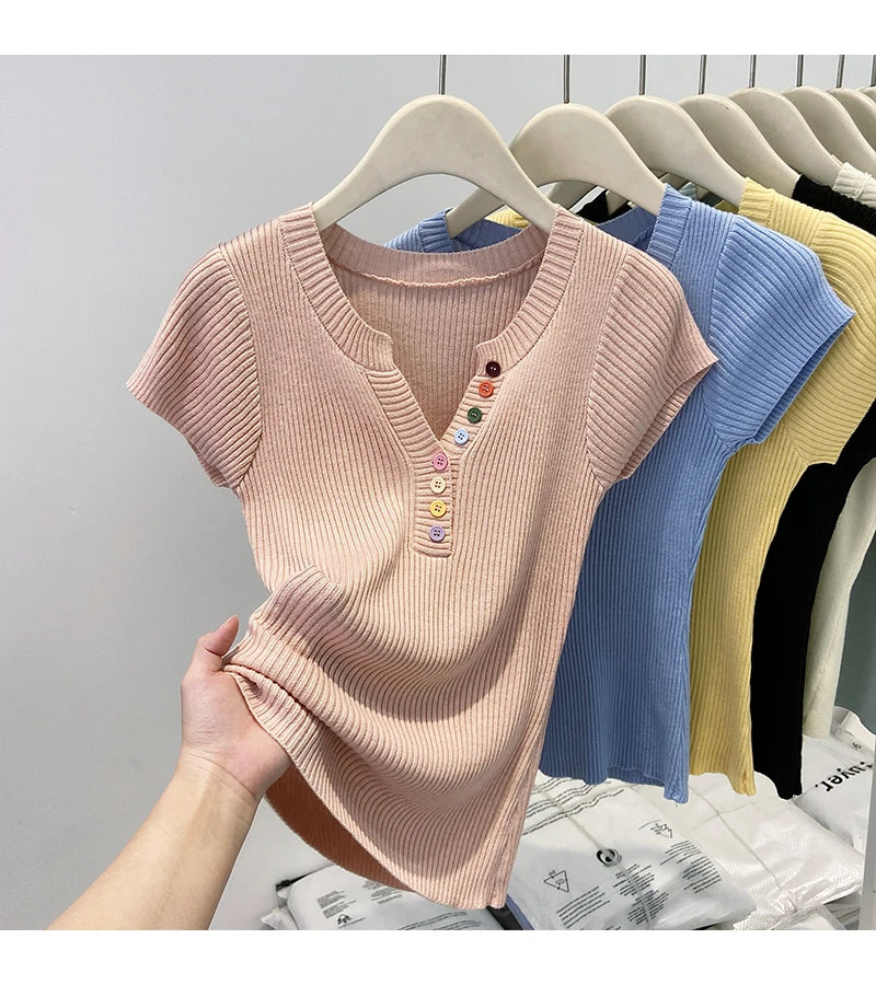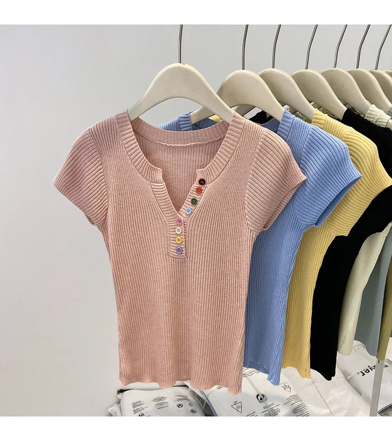 Summer V-Neck Short Sleeve Thin Tshirts Women Pastel Colored Button Knitted T-Shirts Teen-girl Stretch Fitted Tees Y2K Clothing