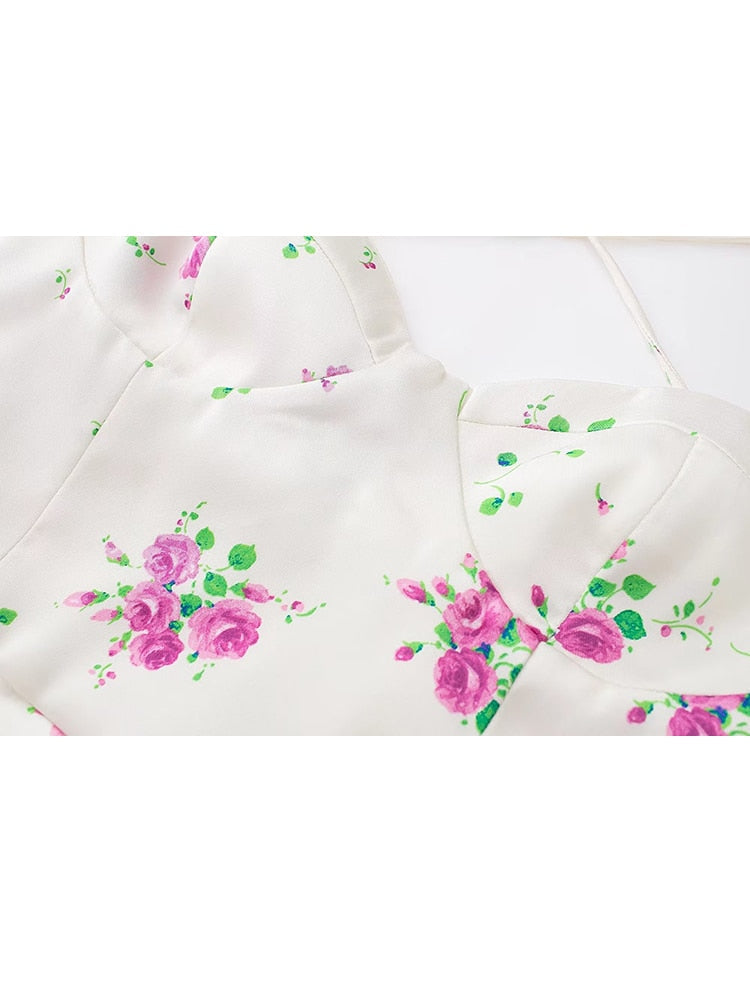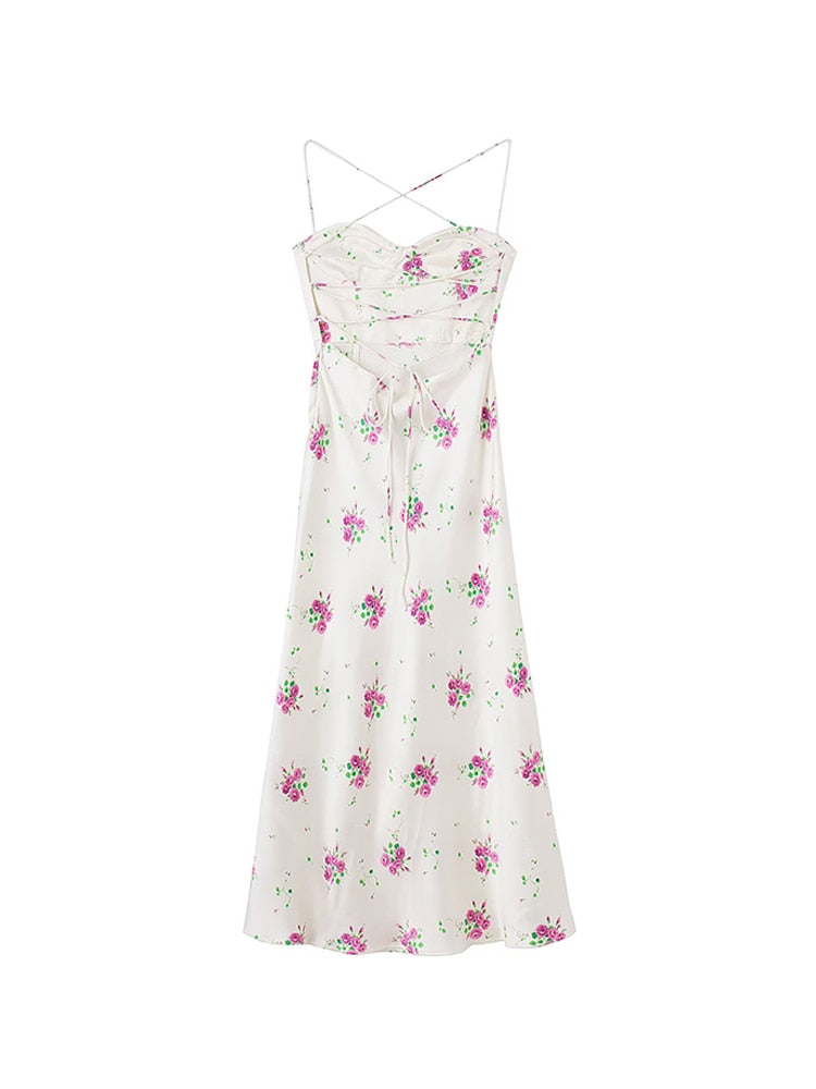 Summer White Satin Dress Women Spaghetti Strap Backless Lace Up Slim Floral Print Midi Dresses robe femme