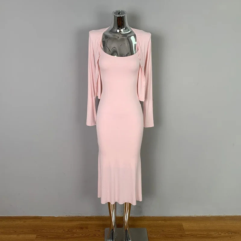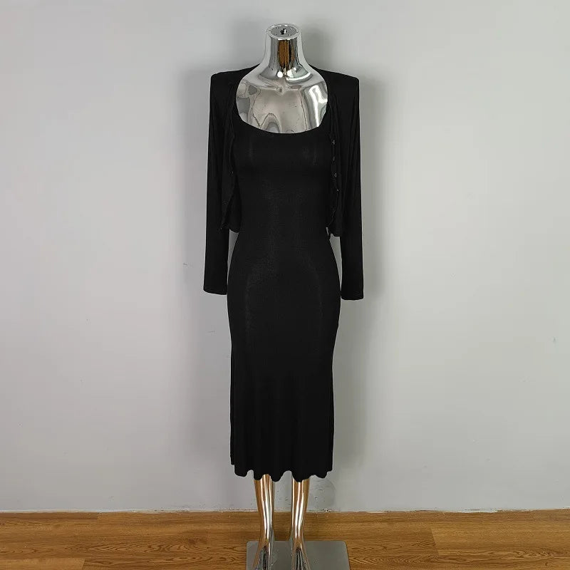 Tight Slip Dress And Cardigan Two Piece Set Cotton Blend O-neck Slim Long Dress + Jacket Women Suit Spring Summer Dress Of Suit