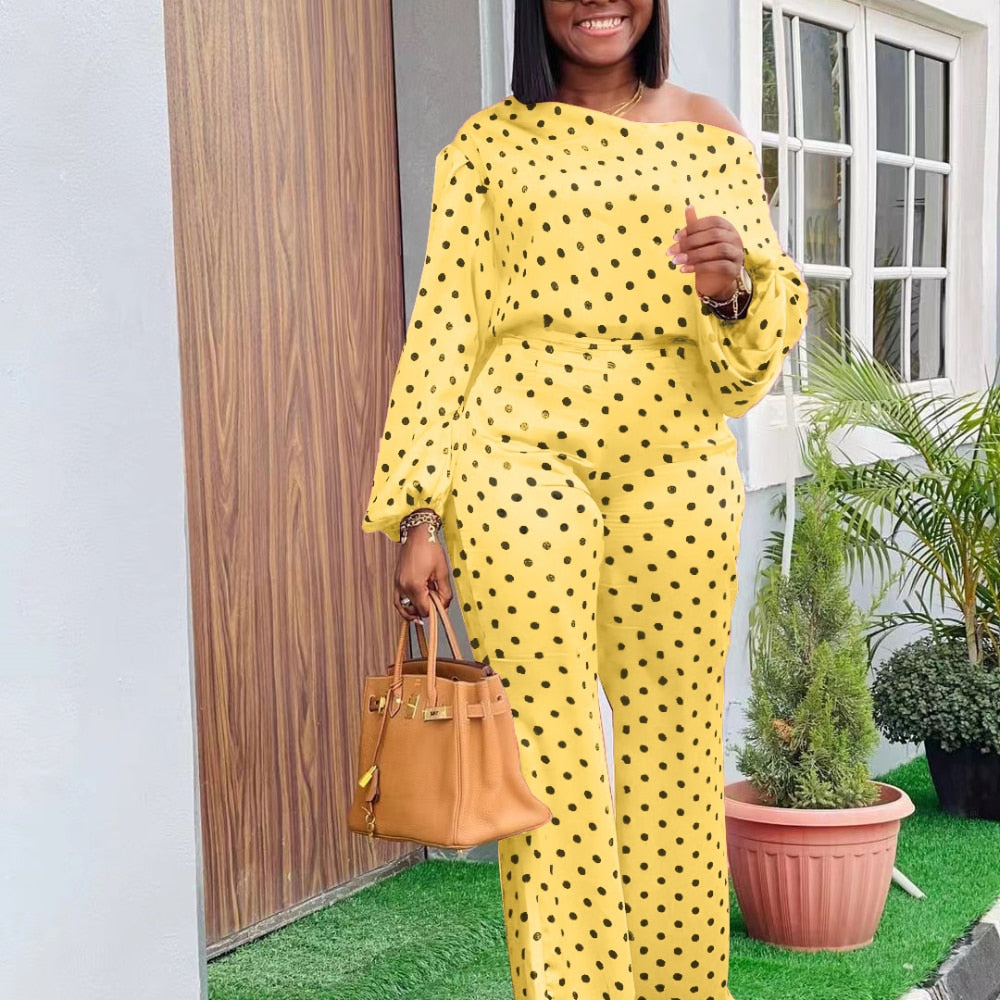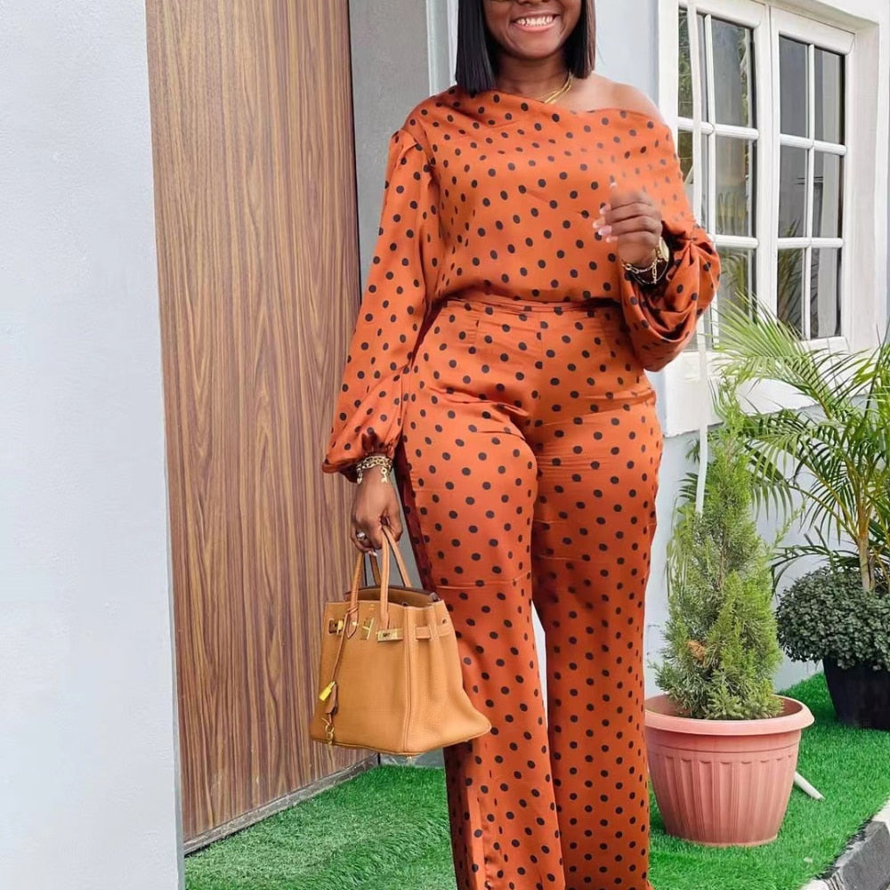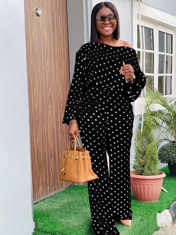 Two Pieces Set women Polka Dot Print One Shoulder Long Sleeves High Waist Pants Autumn Spring Party Evening Casual Sexy Outfits Pbong mid size graduation outfit romantic style teen swag clean girl ideas 90s latina aesthetic