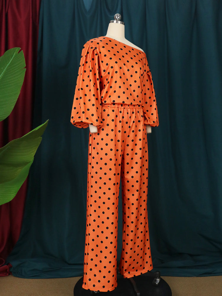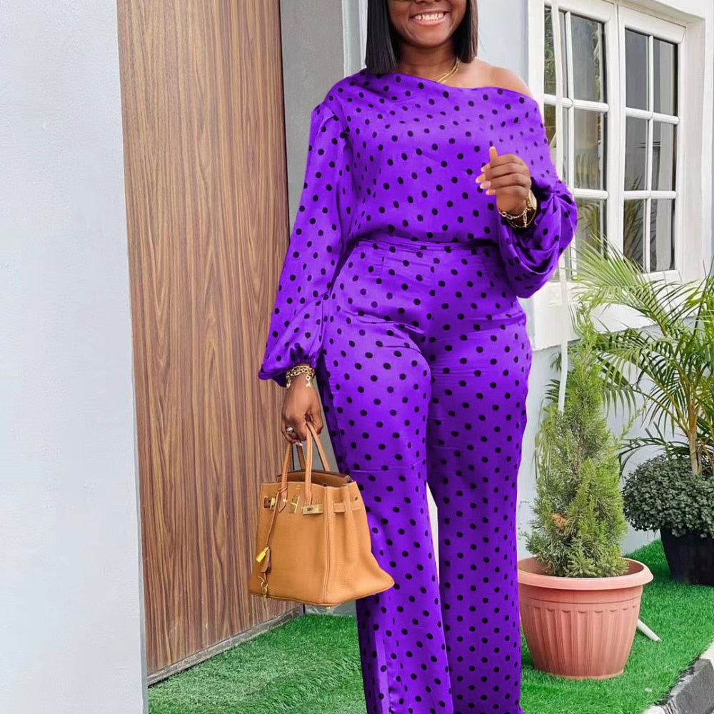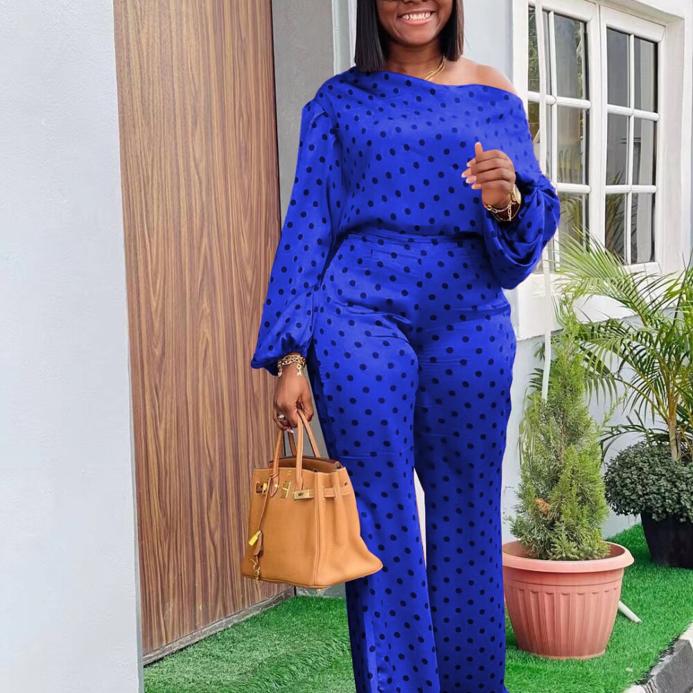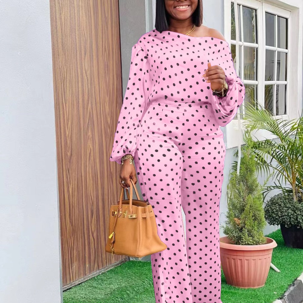 Two Pieces Set women Polka Dot Print One Shoulder Long Sleeves High Waist Pants Autumn Spring Party Evening Casual Sexy Outfits Pbong mid size graduation outfit romantic style teen swag clean girl ideas 90s latina aesthetic