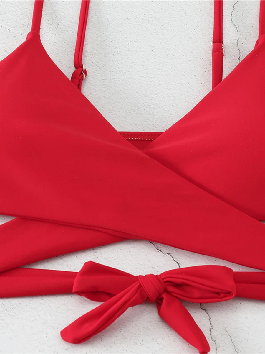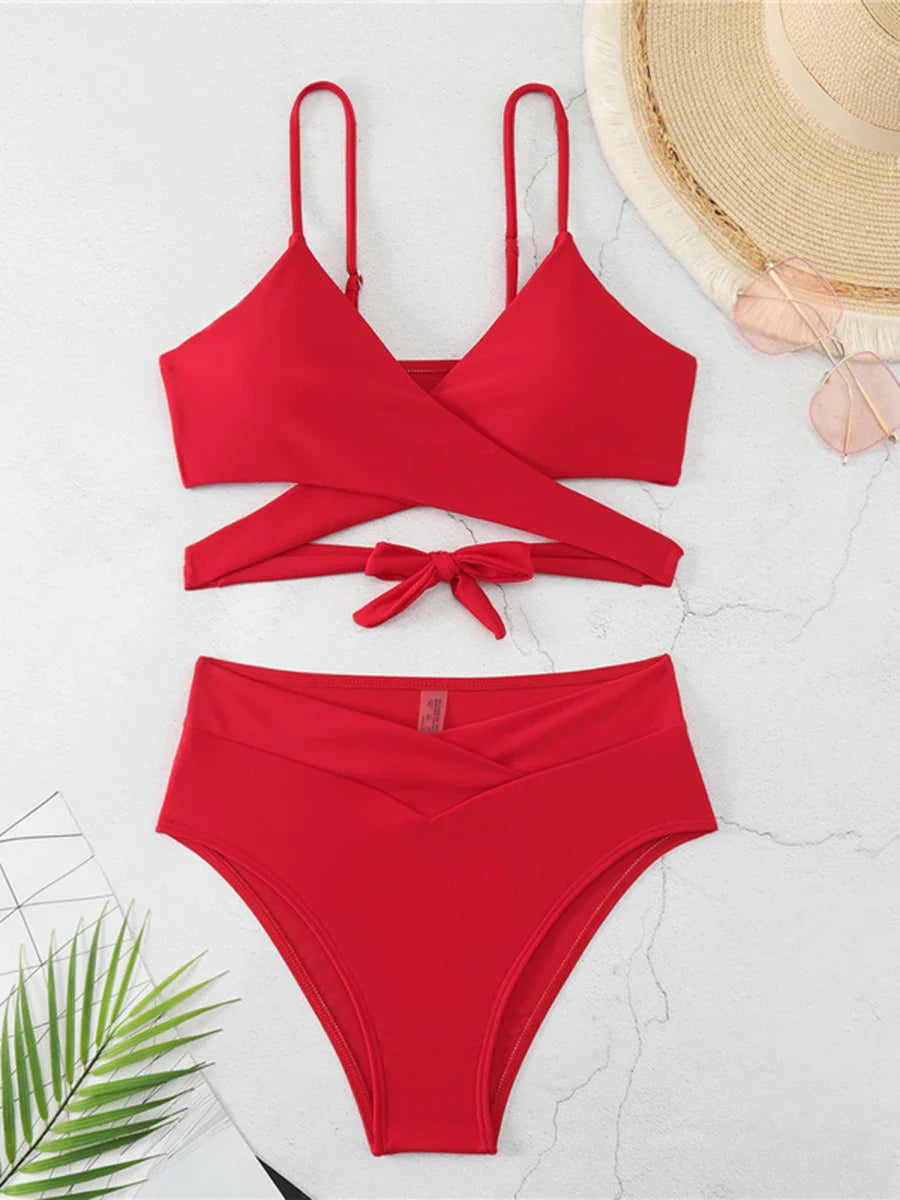 V Neck Cross String Two Piece High Waist Bikini Swimsuit Women Swimwear Female Bather Bathing Swimming Swim Suit Beachwear