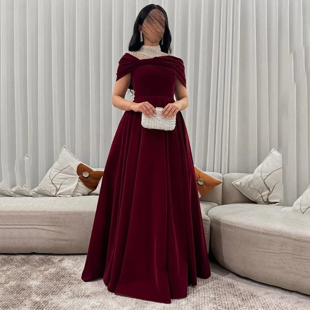 Velvet Evening Gown 2025 Off Shoulder Prom Dress Pleated Pearl High Neck Mesh Panel Long Formal Party Dress Customized