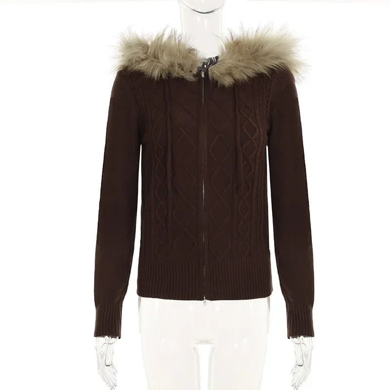 Vintage American High Street Zip Up Knitted Cardigan Sweaters Simple French All Match Lazy Women Jumpers Y2k Aesthetic Clothes