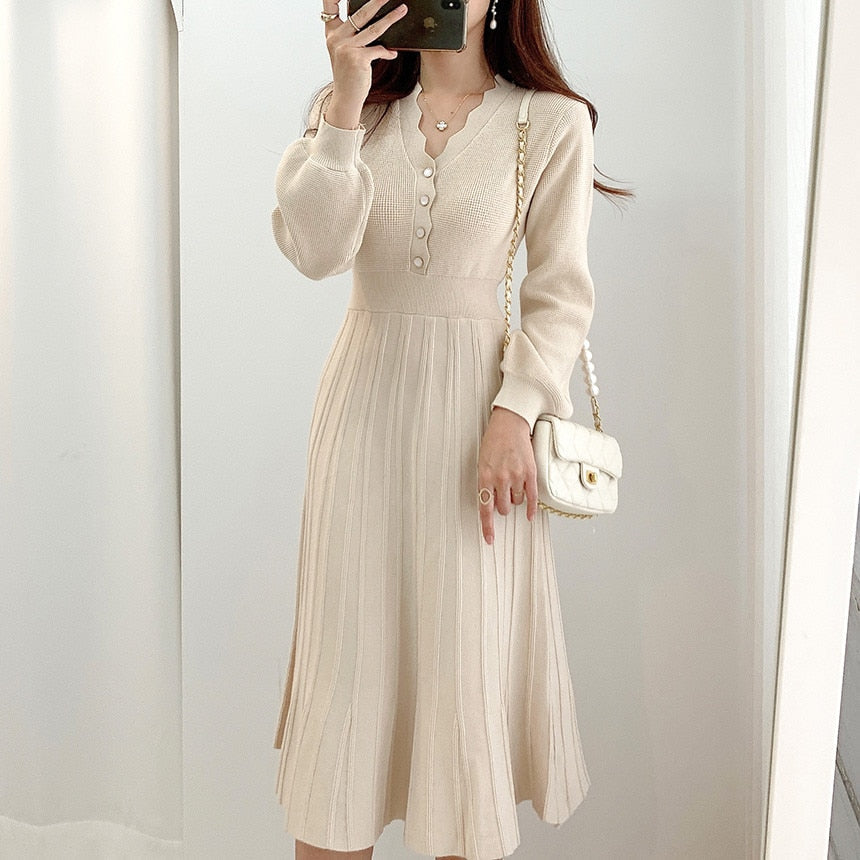 Vintage One Piece Korean Pleated Dress Long Sleeve Slim Woman Sweater Dresses Knitted Elegant Midi Party Woman Dress Autumn