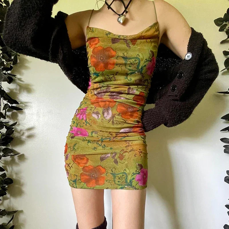 Vintage Spaghetti Strap Flowers Printing Skinny Dress