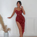 Women Evening Slip Dress Elegant Luxury Woman V-neck High Waist Tunic Midi Wedding Birthday Party Sequin Dresses Purple Red