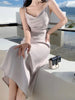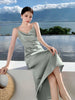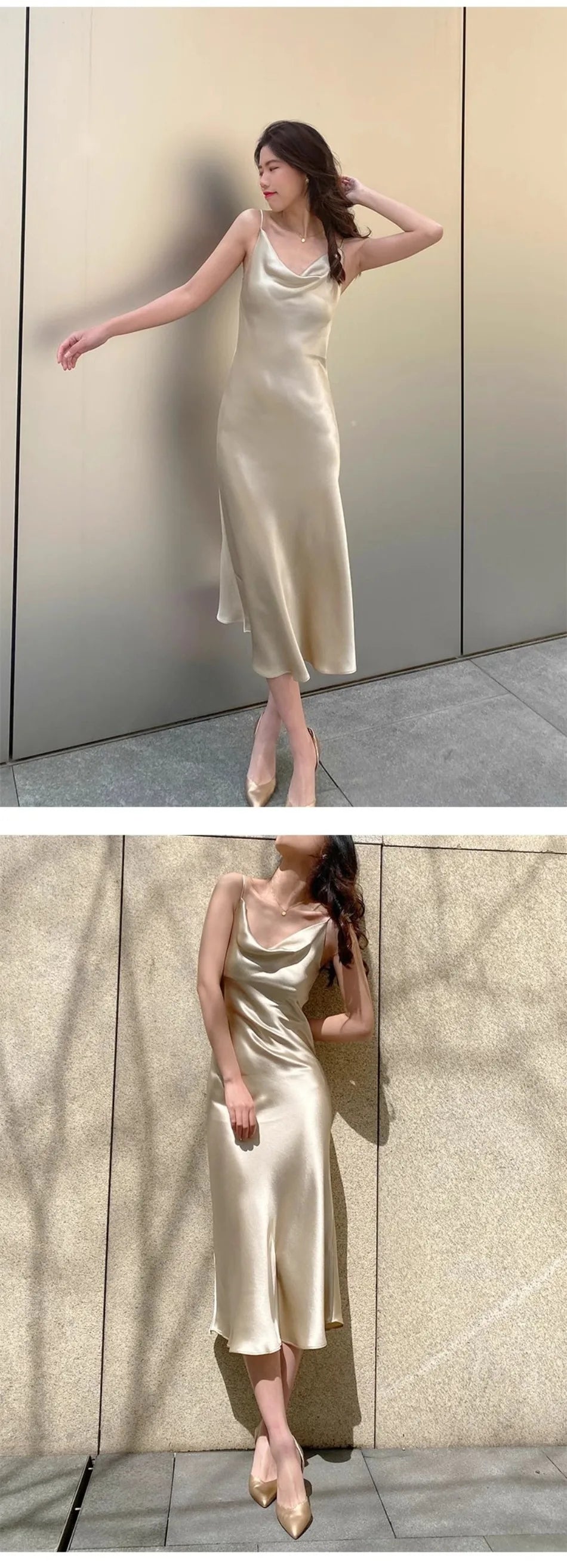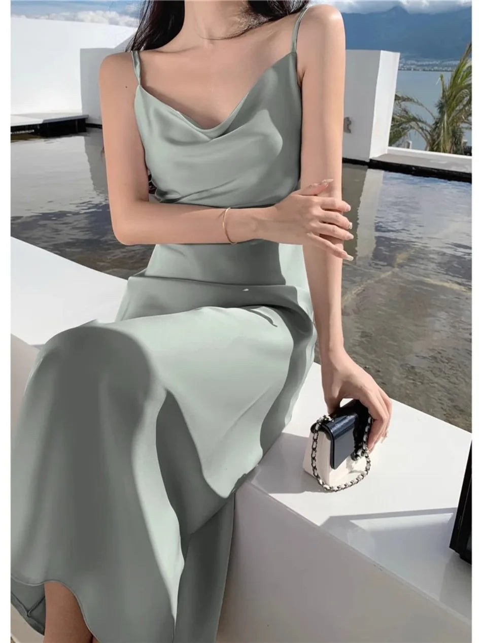 Women Satin Solid Color Swinging Collar Evening Dress Elegant Party Dresses New Summer Sexy Spaghetti Strap Backless Maxi Dress