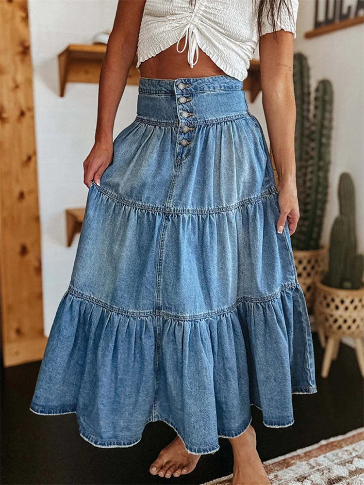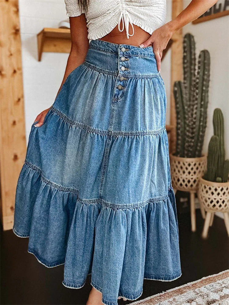 Solid color denim fabric makes you stand out from the crowd; High waist. button placket. ruffled hem. A-line and ankle length design; Casual summer skirts; Cute skirts for women to add a touch of elegance to your outfits