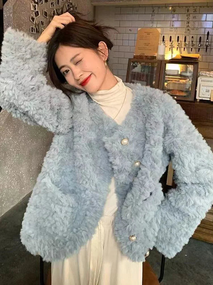 Women Sweet Cute Faux Lamb Coat Winter Warm Thick Slim Long Sleeve Vintage Jacket Korean O Neck Elegant Pearls Buttons Tops New