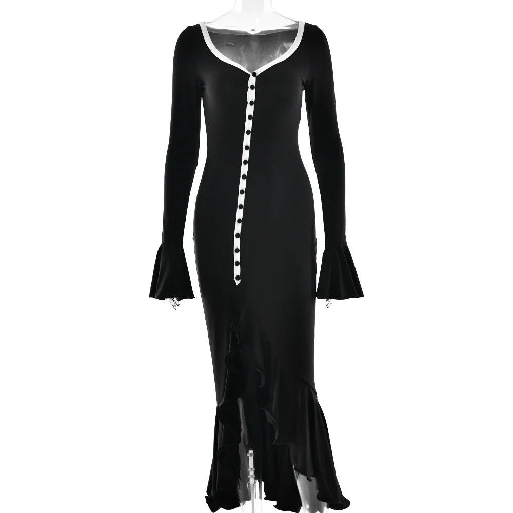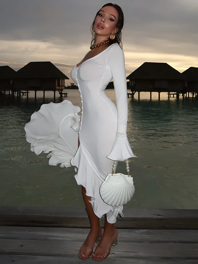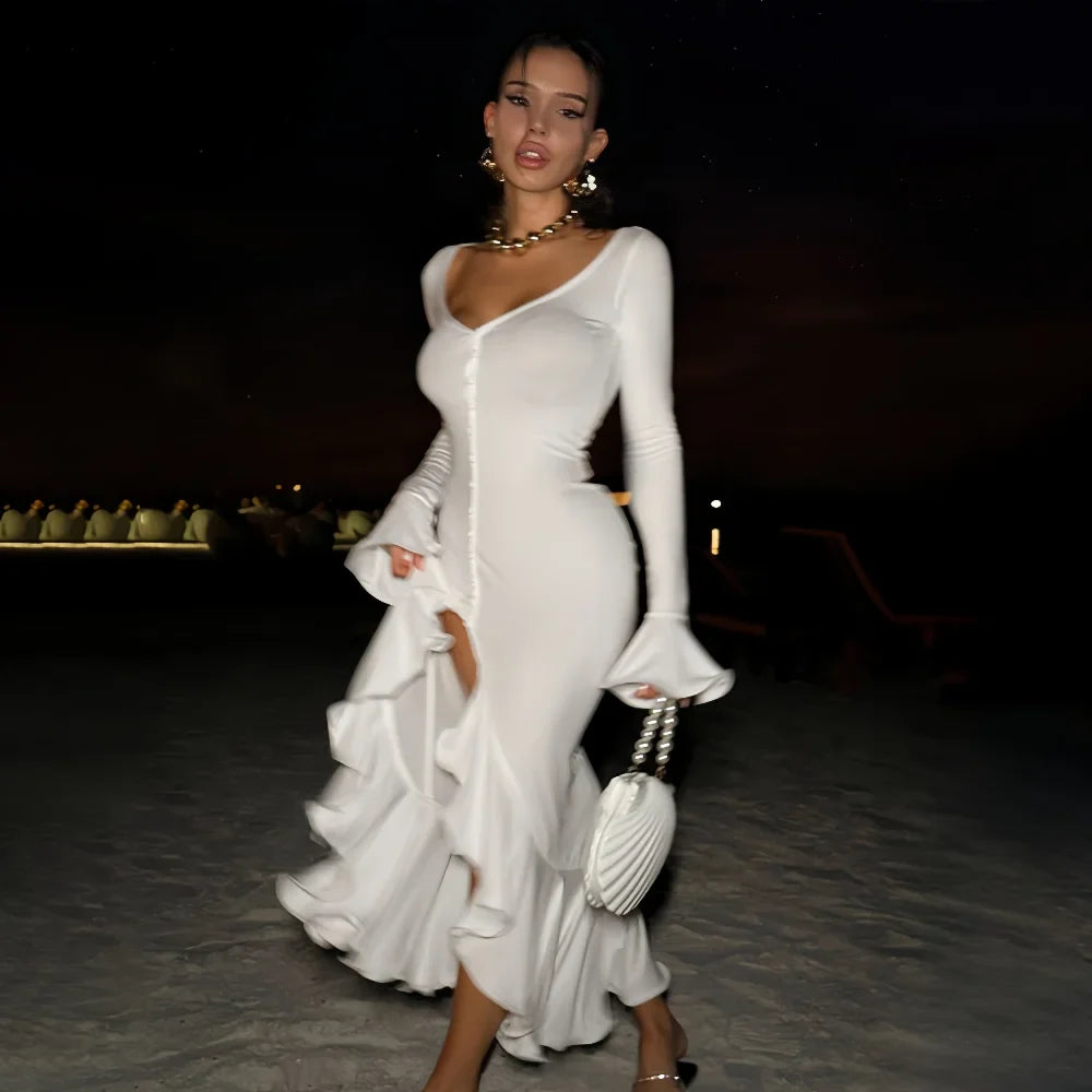 Women's A-Line Bodycon Maxi Dress Ruffles Hem V-Neck Asymmetrical Buttons Long Sleeve Long Dress Party Streetwear Vestido