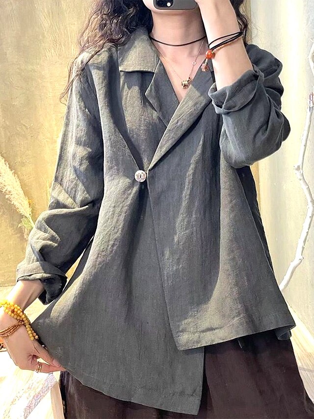 Gender:Women's.Outerwear Type:Blazer.Occasion:Outdoor.Work.Going out.Formal.Season:Fall.Spring.Function:Windproof.Comfortable.Fabric:Cotton.Placket:Single Breasted.Style:Streetwear.Modern Style.Stylish.Outerwear Length:Regular.Pattern:Plain.Design:Irregular Hem.Button.Neckline:Turndown.Sleeve Length:Long Sleeve.Fit Type:Regular Fit.Elasticity:Micro-elastic.Look After Me:Washable.Hand wash.Bust (cm):M:104;L:108;XL:112;XXL:116;3XL:120.Shoulder Width (cm):M:39;L:40;XL:41;XXL:42;3XL:43.Length (cm):M:68;L:69;XL:70;XXL:71;3XL:72.Front page:FF.Listing Date:05/12/2023.