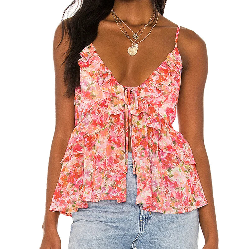 Womens Floral Ruffles Trim Camis Top Y2k V Neck Open Front Crop Tops Vest Beach Vacation Going Out Teen Girls Summer Tank Tops