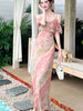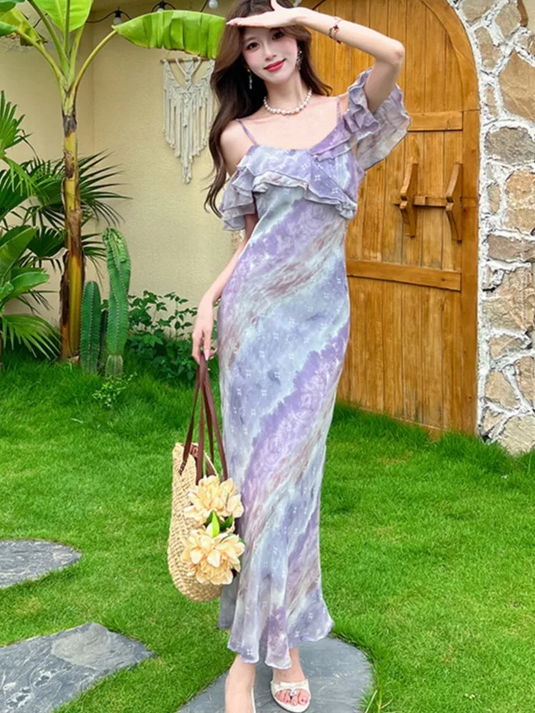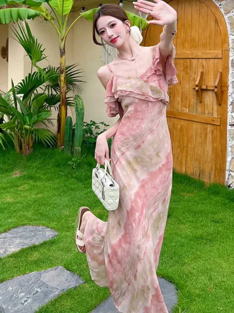 Womens Pink Floral Chic Off Shoulder Sexy Sling Long Dress Summer Elegant Ruffled Casual Dress 2025 Korena Fashion Bodycon Dress