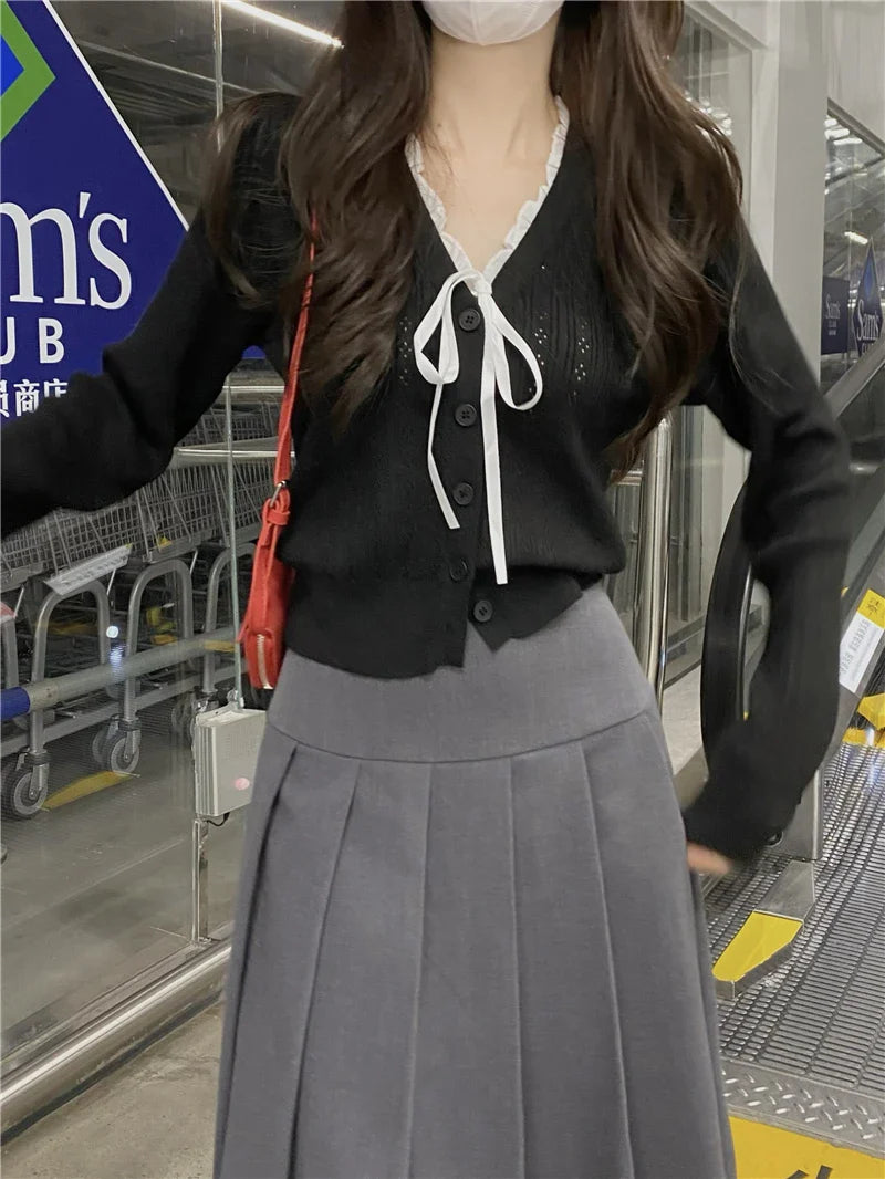 Women's Pointelle Knit Cardigan with Bow Long Sleeve Button Front Sweater Openwork Cardi Teen-girl Fairycore Balletcore Outfit
