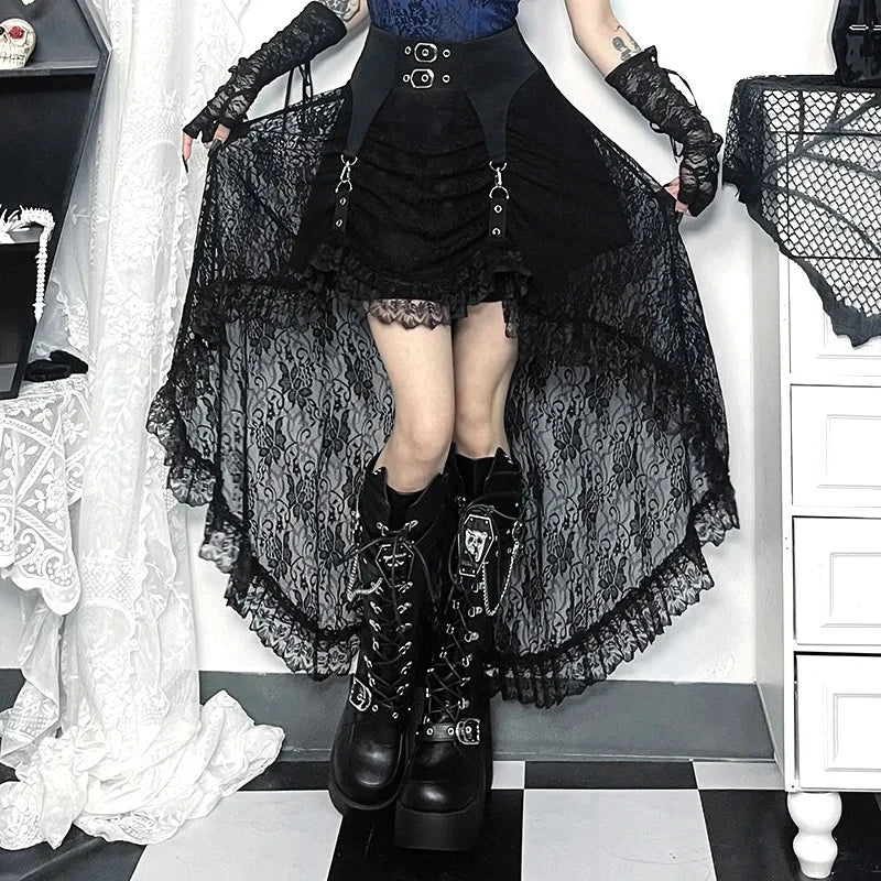 Y2K Black Floral Lace Mesh A-Line Long Skirts Goth Vintage Aesthetic Cocktail Party Skirt Women New Fashion Streetwear