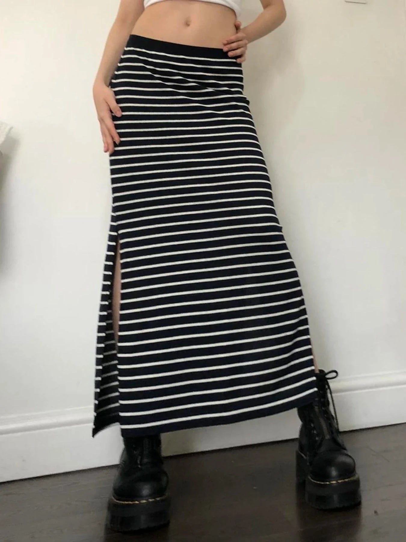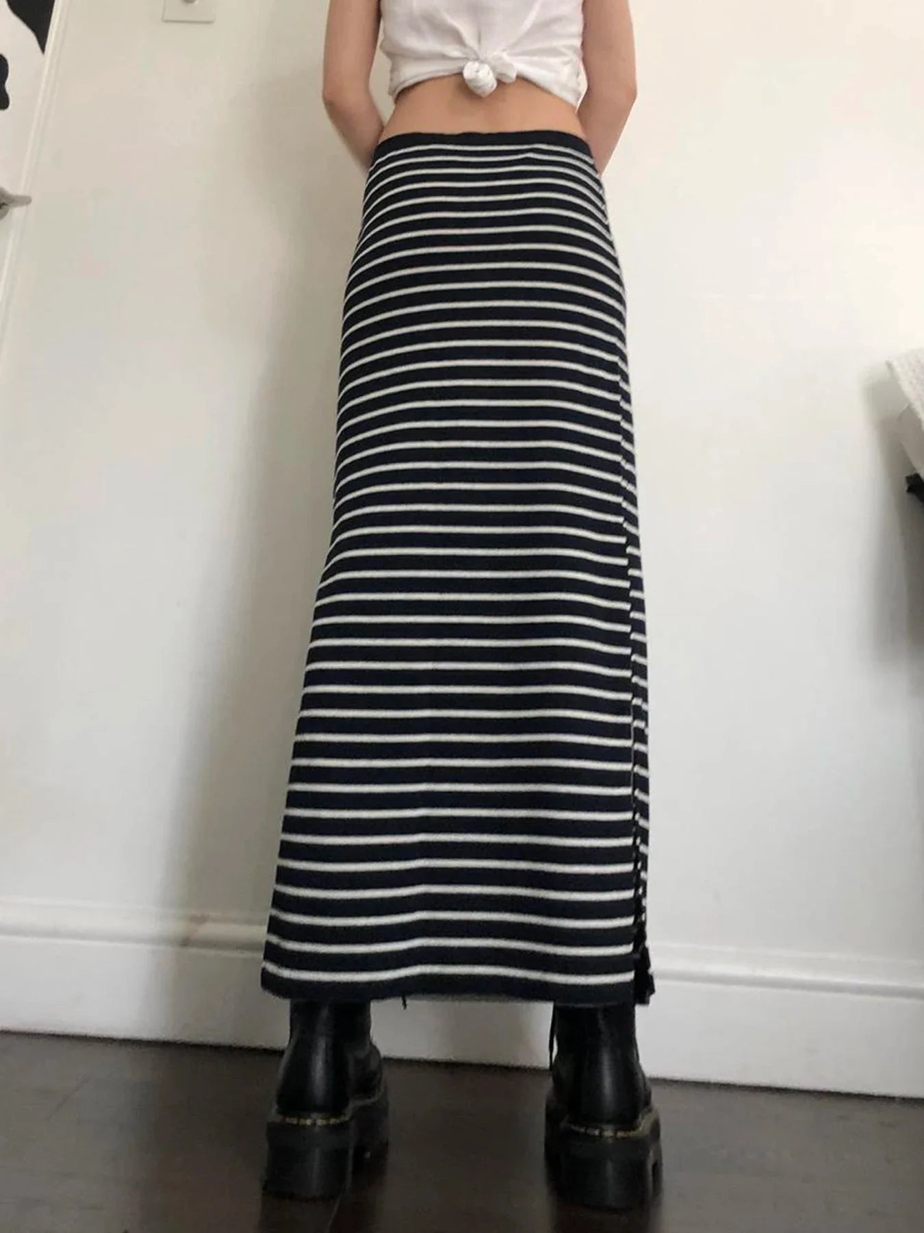 Y2K Black White Stripe Long Skirts Women Split Elastic Waist Basic Elegant Knitted Skirt