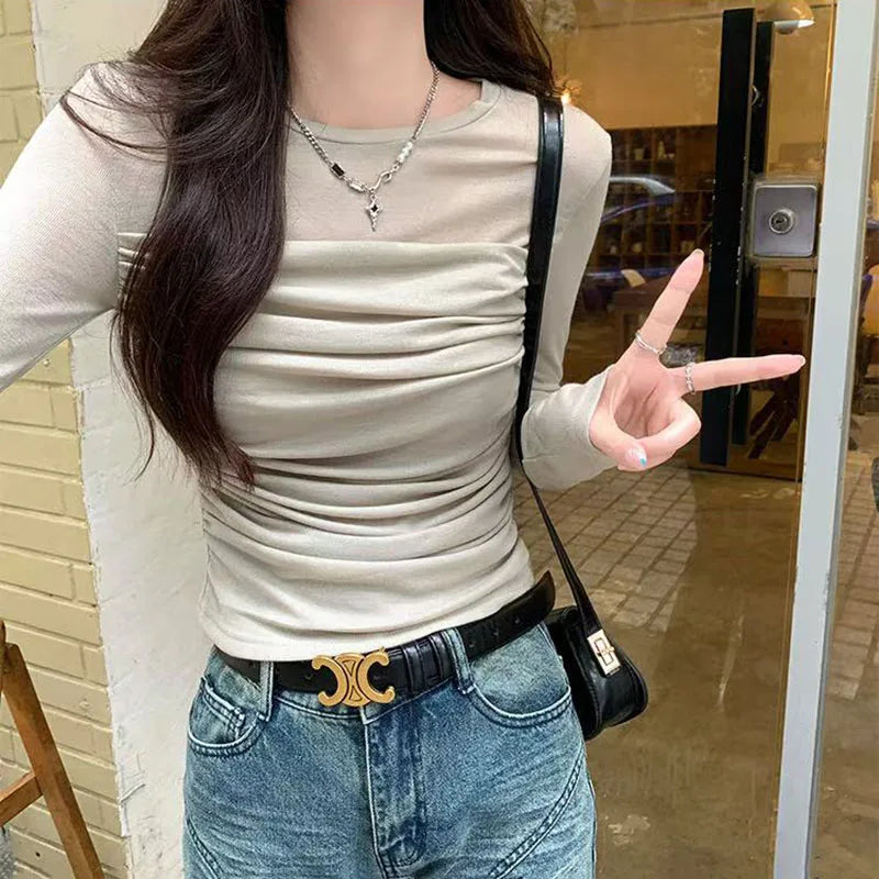 Y2K Long Sleeve Mesh Women T Shirt Spring Fashion Sexy O Neck Slim Female Tops Korean Chic Folds Cropped Bottoming Tees New