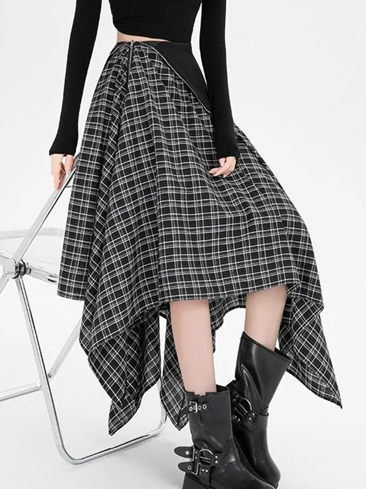 Y2K Streetwear Plaid Long Skirt Women High Waist Retro Hip Hop Irregular Skirt Fall Casual American Gothic Female Long Skirts