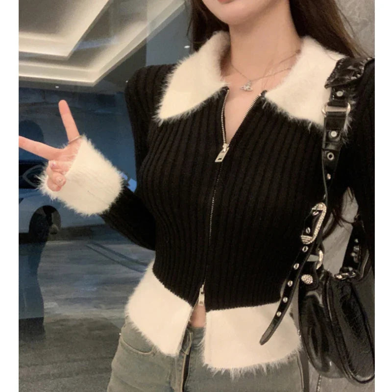 Y2K Zipper Front Rib Knit Top for Women Contrast Fuzzy Collared Zip-Up Sweater Crop Cardigan Autumn Winter Teen-girl 90s Outfit