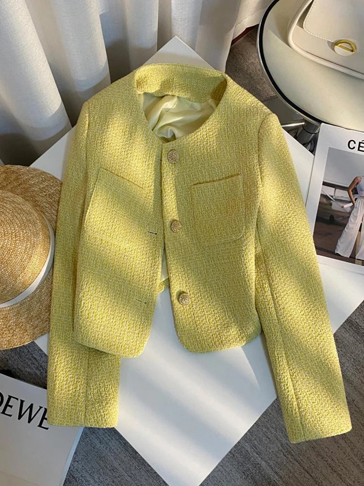 Yellow Sweet Tweed Jacket Women Elegant Retro Slim Long Sleeve Short Coat Korean O Neck Casual Fall Female Vintage Outwear